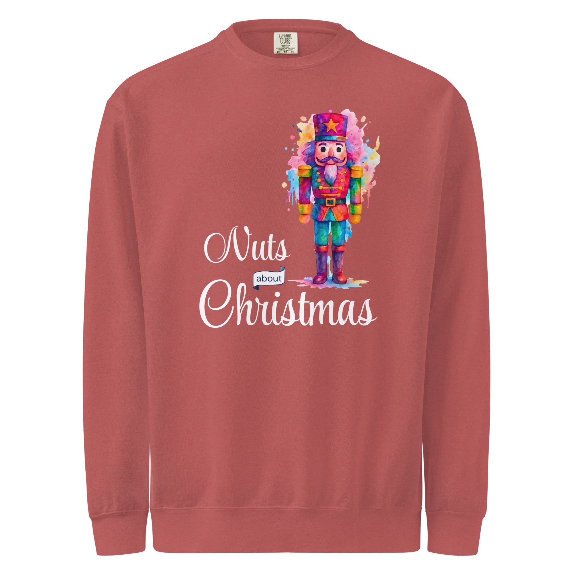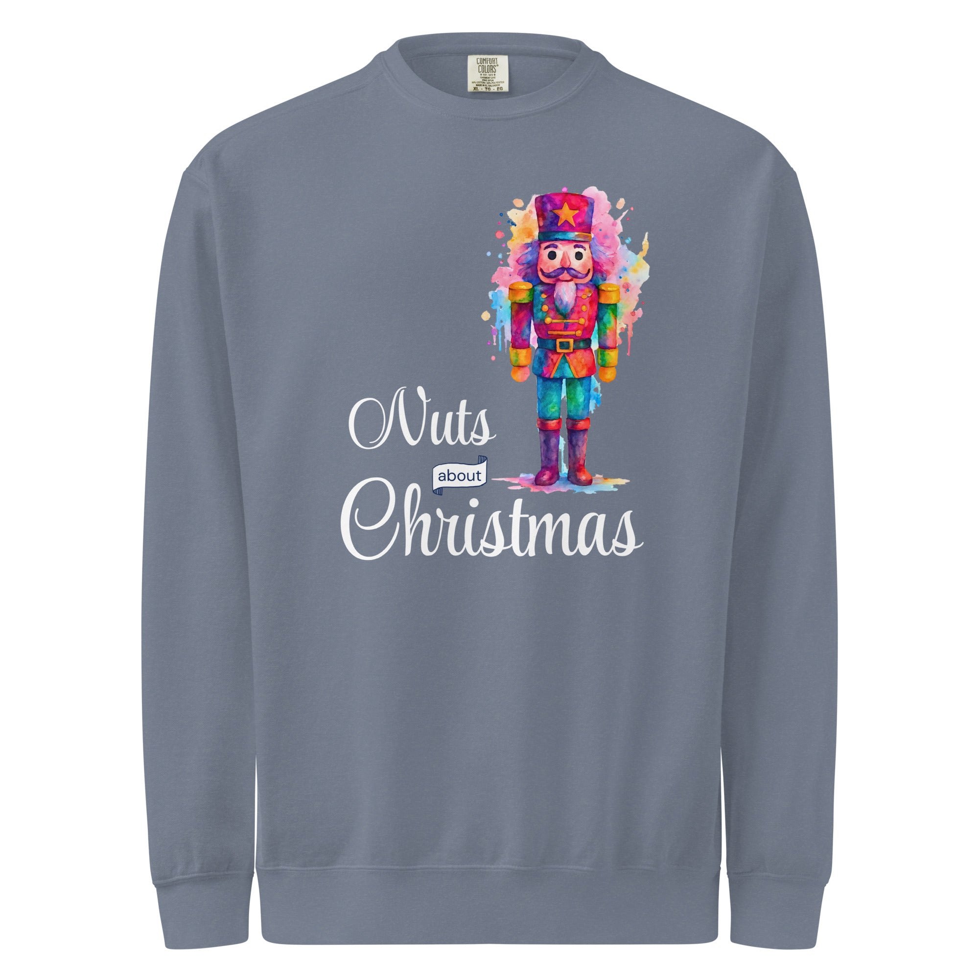 The Ursa + Leo "Nuts About Christmas" cozy Christmas sweatshirt brings a playful burst of holiday cheer to your wardrobe with its vintage washed look and bright colorful design. This adult holiday sweater features a vivid watercolor nutcracker that blends classic Christmas tradition with a modern, whimsical twist—perfect for parents, grandparents, and anyone eager to showcase their festive spirit.
