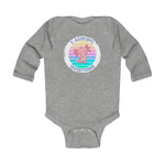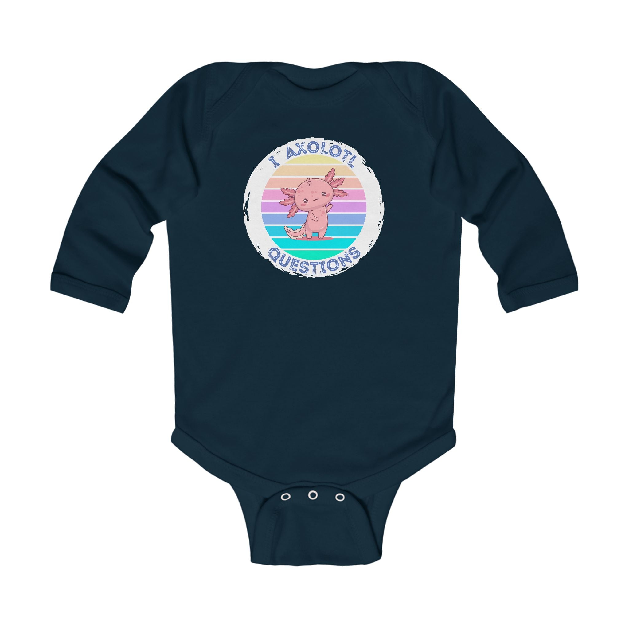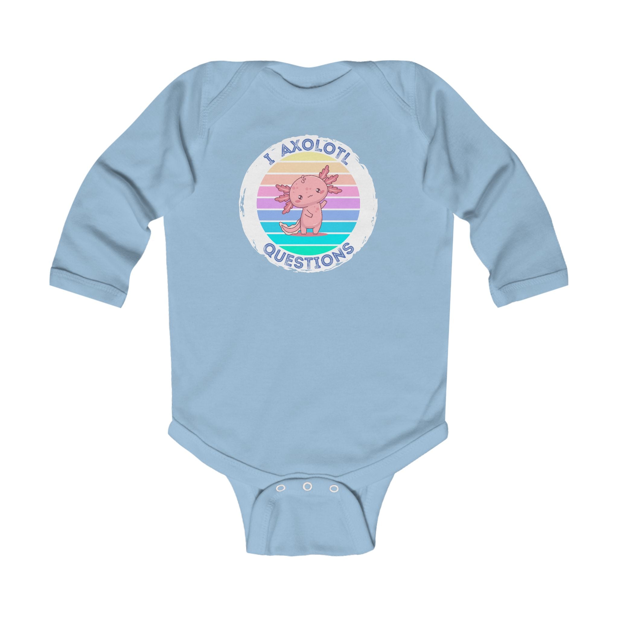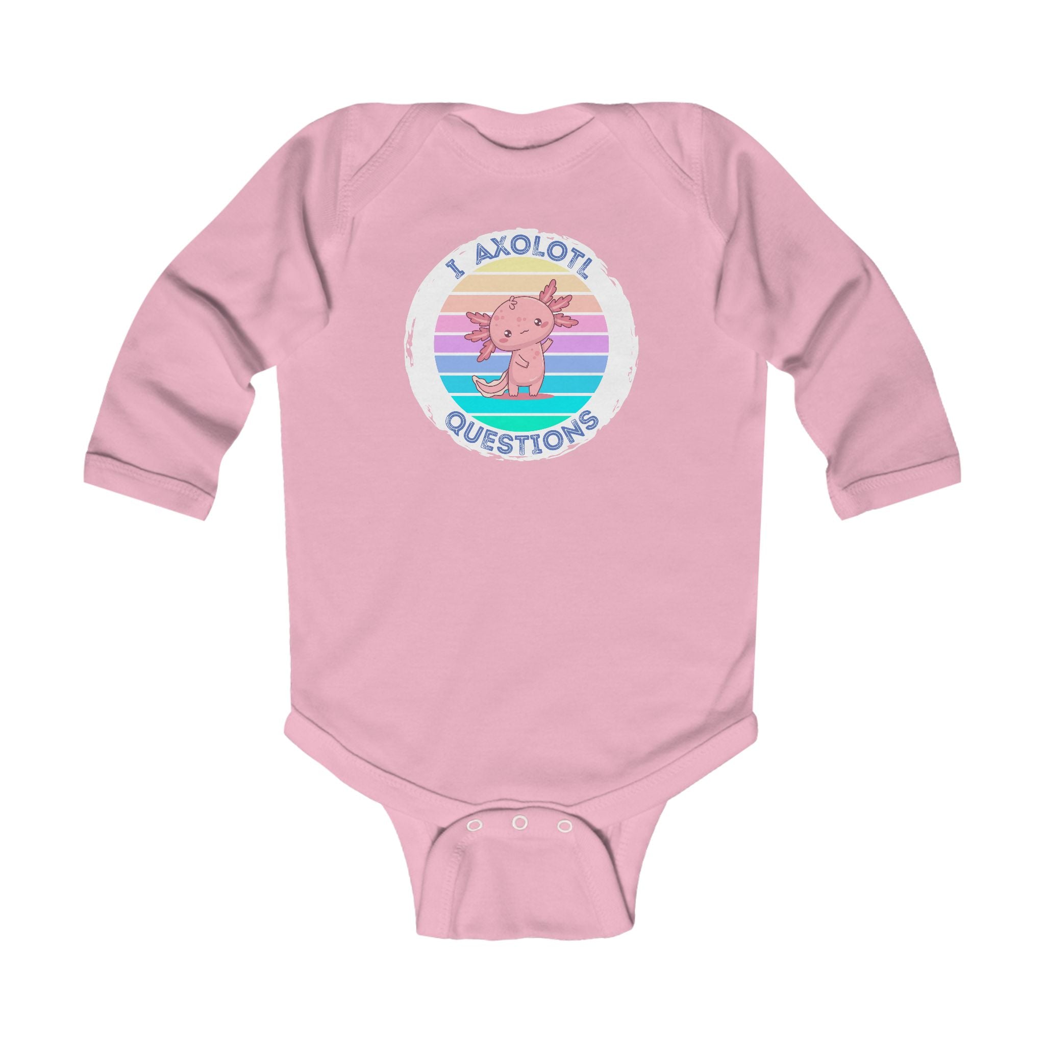Soft, simple, and full of quiet humor—this long-sleeve infant bodysuit wraps little ones in gentle cotton while sharing a playful message. A pastel-striped badge sits over the chest, featuring a curious axolotl illustration and the phrase “I axolotl questions.” The light fabric moves with baby’s tiny wriggles, while ribbed binding at the neck and leg openings keeps everything cozy and easy to pull on. Three matching snaps at the crotch make diaper changes quick. Subtle, tear-away label keeps the back soft against delicate skin. This piece layers easily under sweaters or pairs with leggings for chilly days, bringing a touch of whimsy to everyday moments.
