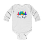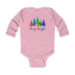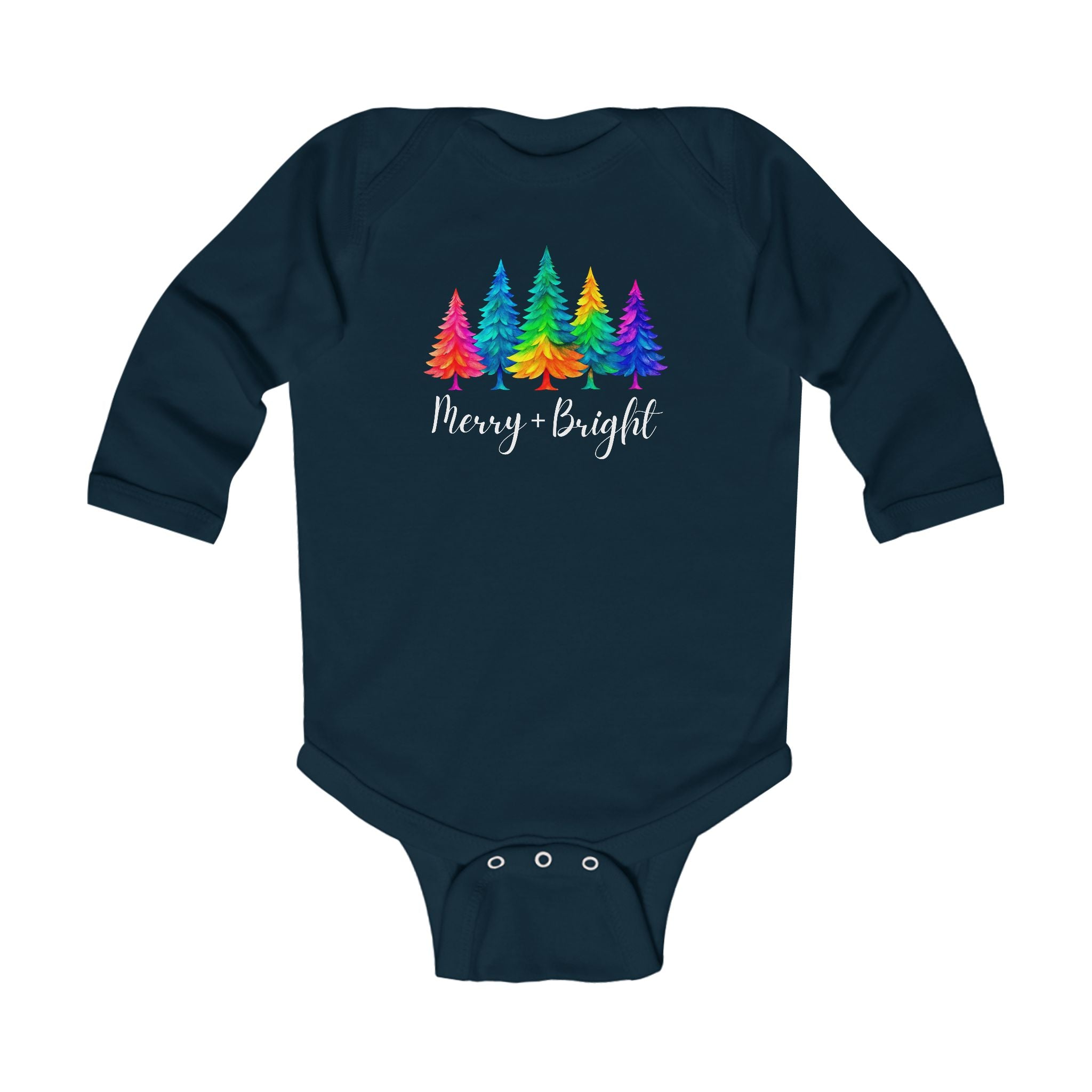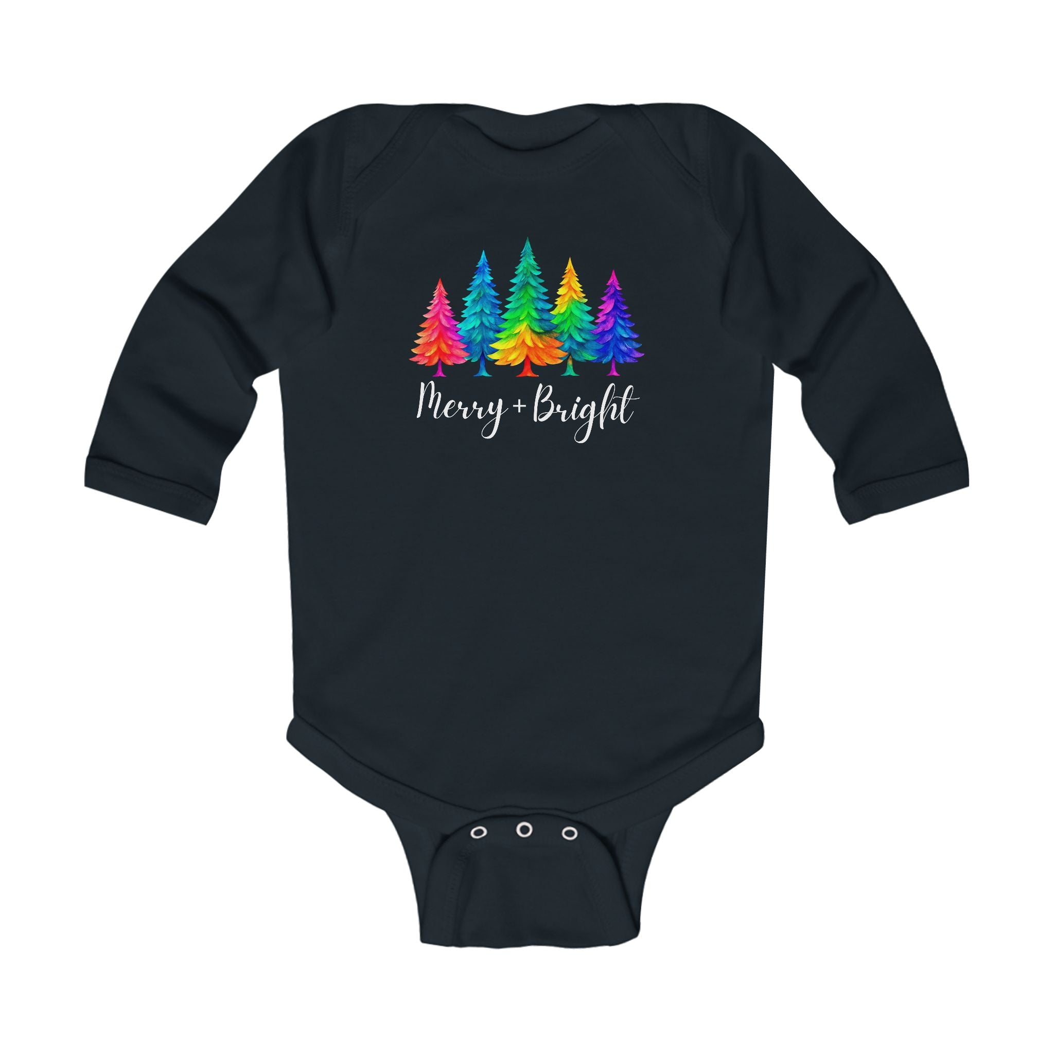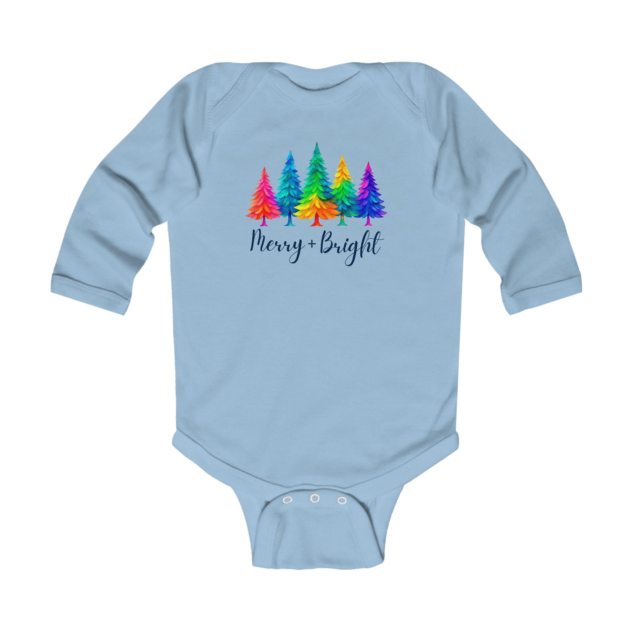 Let your little one shine in bold, colorful style with our Ursa + Leo Sassy “Merry + Bright” Baby Long Sleeve Bodysuit! This cheerful, gender-neutral holiday design features a rainbow forest of Christmas trees with a hand-lettered “Merry + Bright” script — a playful pop of color that lights up photos, school parties, cookie-baking days, and twinkling light parades.