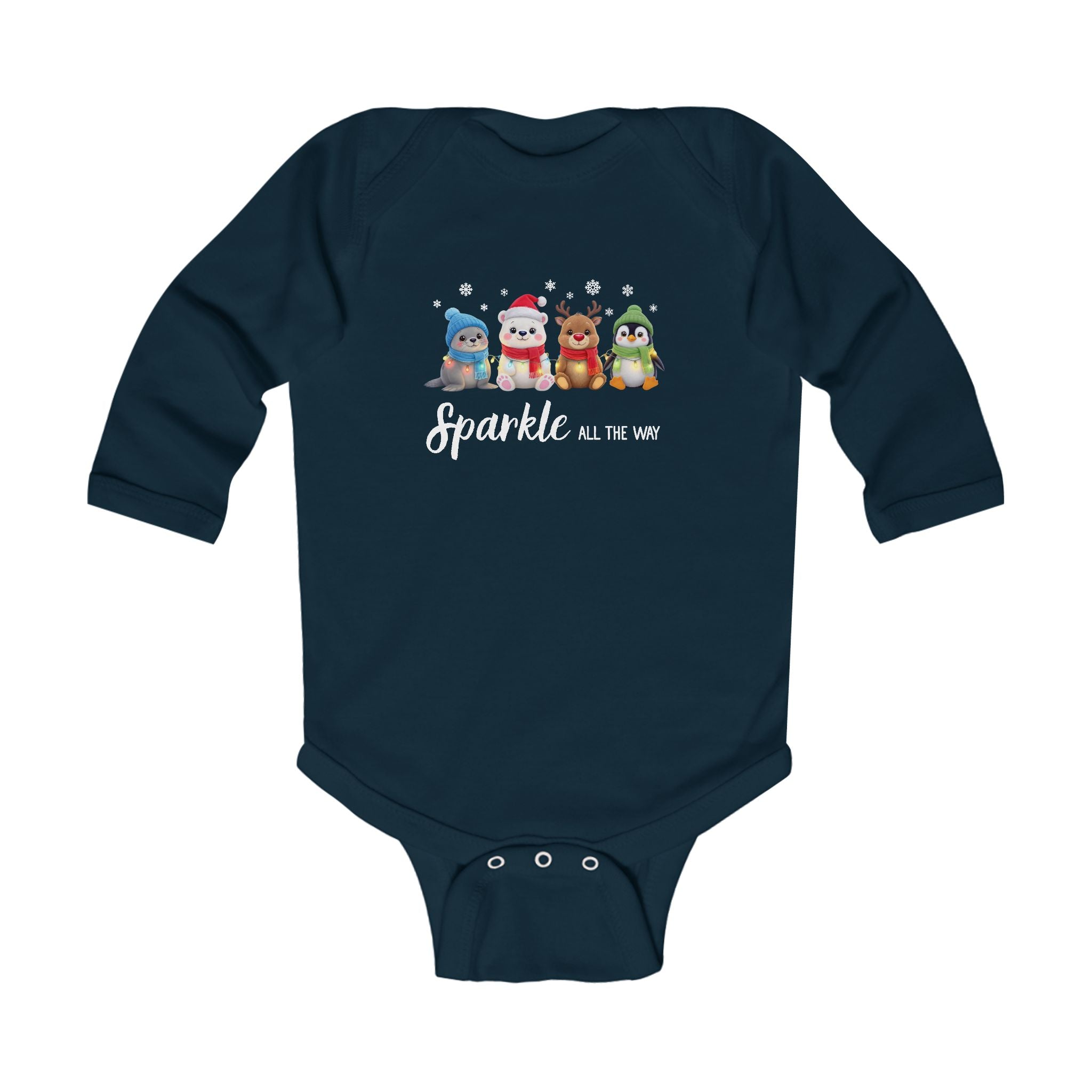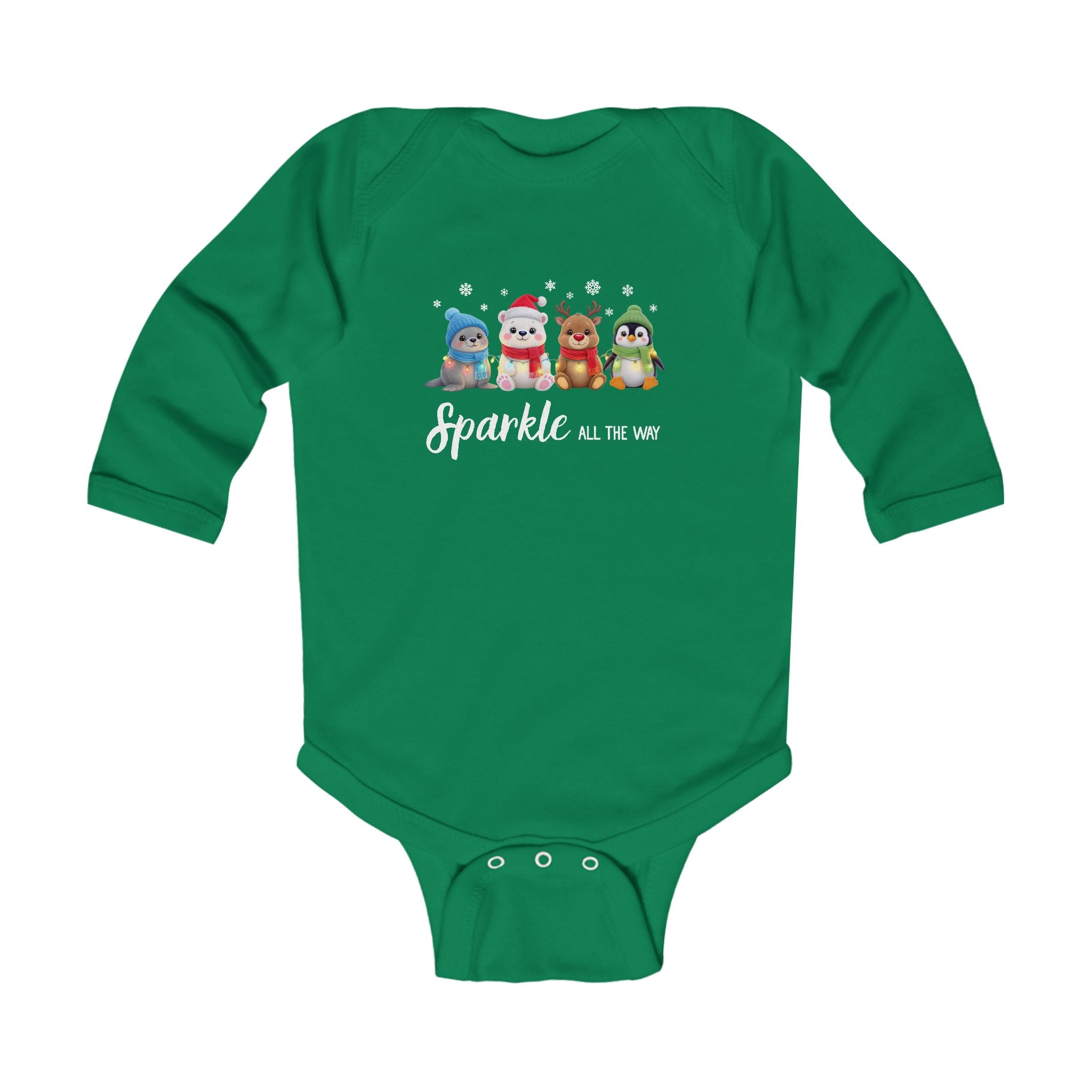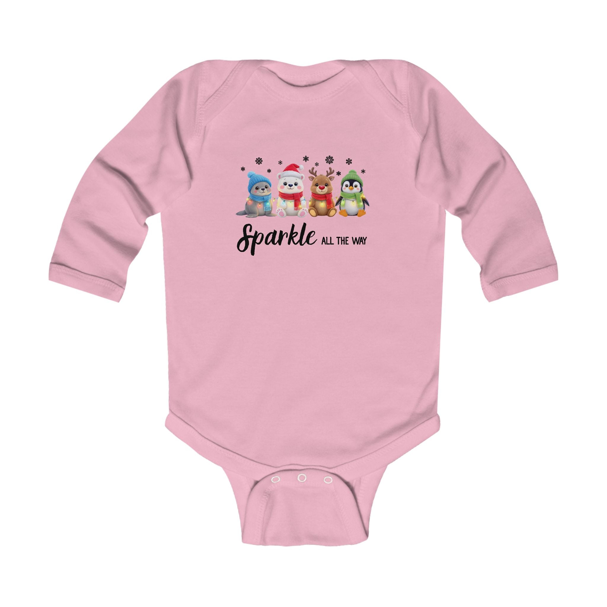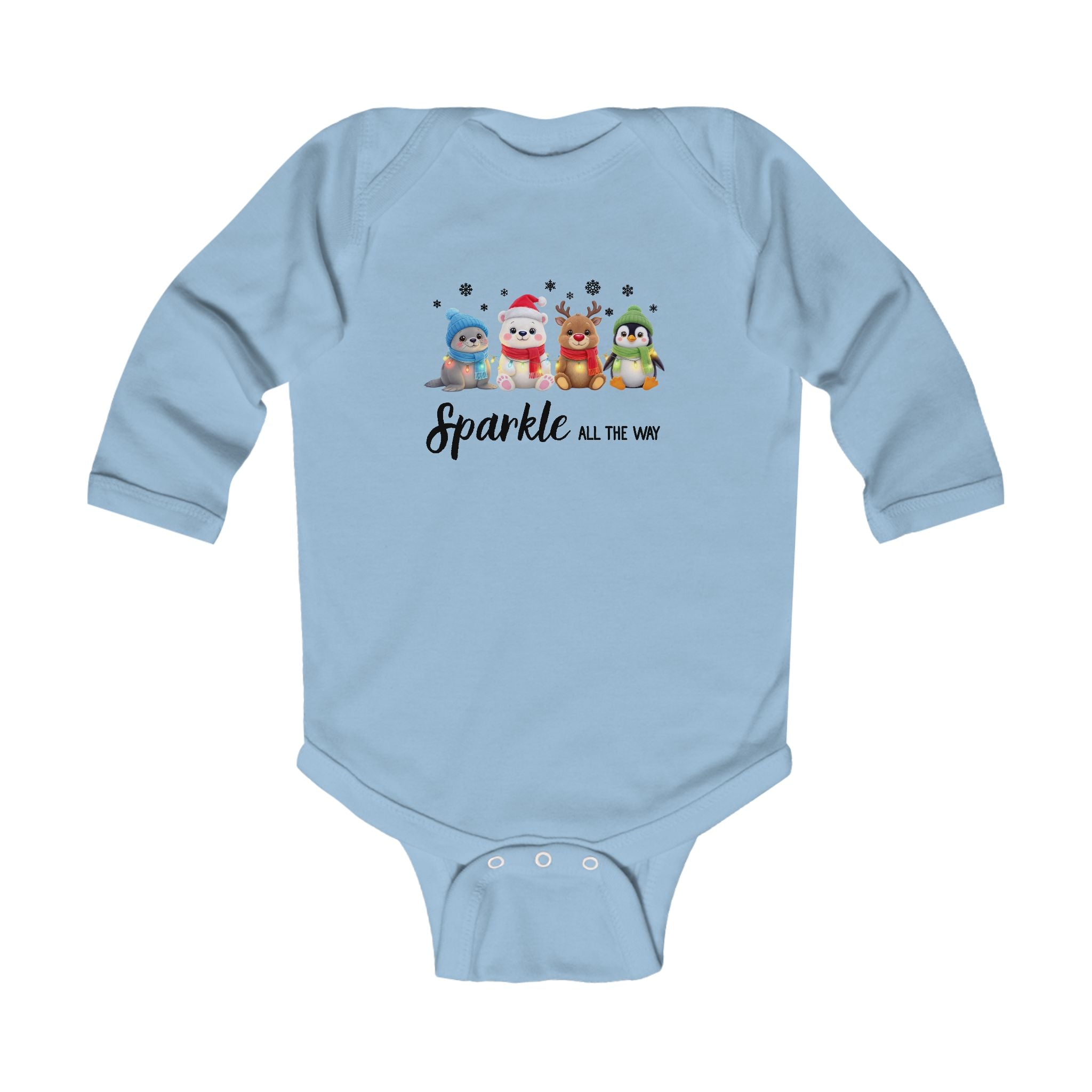 Give your baby a twinkly dose of cheer with our Ursa + Leo “Sparkle All The Way” Baby Long Sleeve Bodysuit! This playful, gender-neutral holiday design features a seal, polar bear, reindeer, and penguin strung with glowing fairy lights—four frosty friends ready to light up every celebration. With bright colors and whimsical charm, it’s perfect for school concerts, photos with Santa, and cozy nights in—and it pairs beautifully for matching family outfits across all ages.