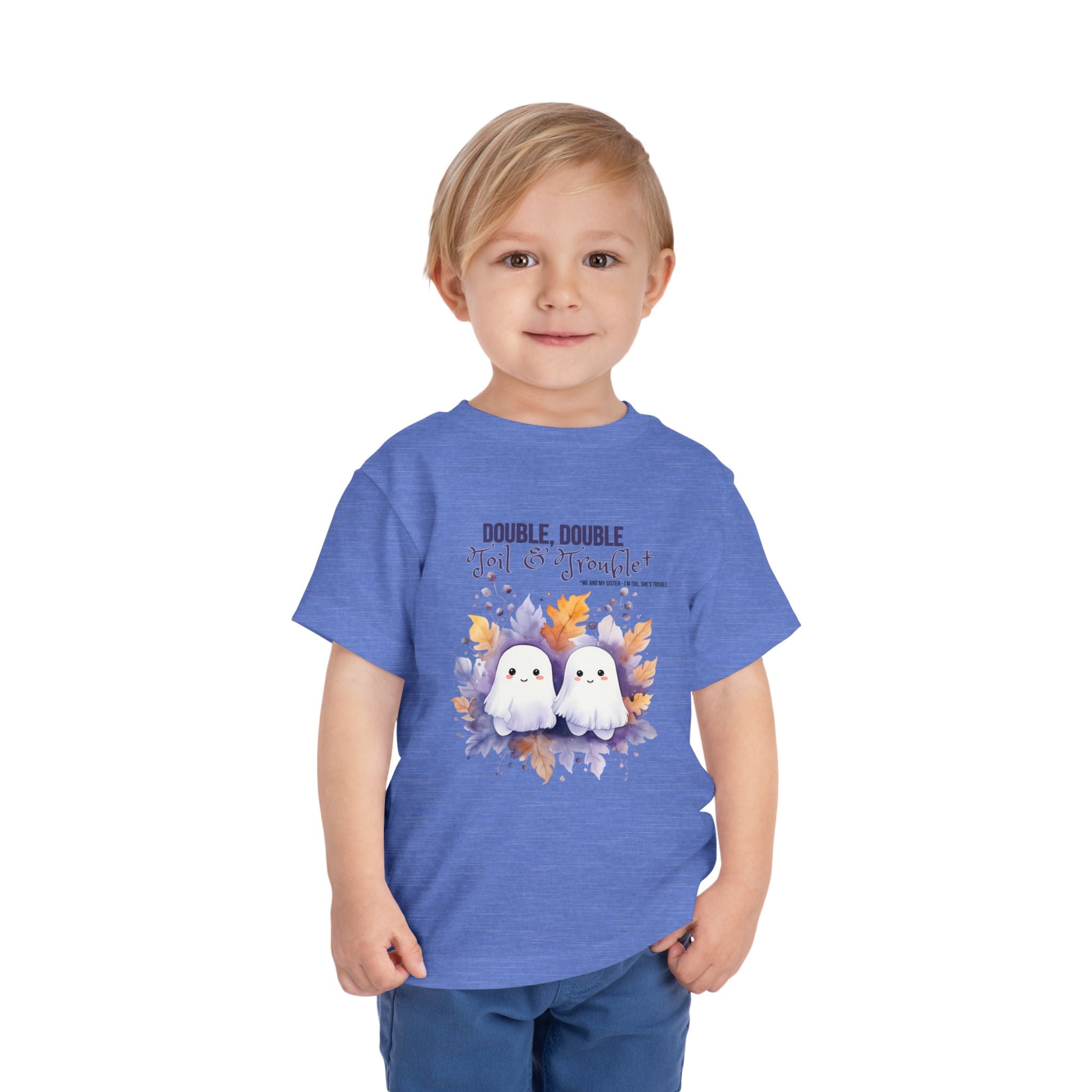 Add a touch of spooky sweetness to your toddler’s Halloween wardrobe with the Ursa + Leo “Double Double Toil & Trouble” Sister Sibling Toddler T-Shirt! This adorable tee features two smiling ghost siblings surrounded by autumn leaves, paired with the playful phrase “Double, Double Toil & Trouble” and the text “Me and my sister – I’m toil, she’s trouble.” It’s perfect for any toddler who loves celebrating Halloween with their sister.